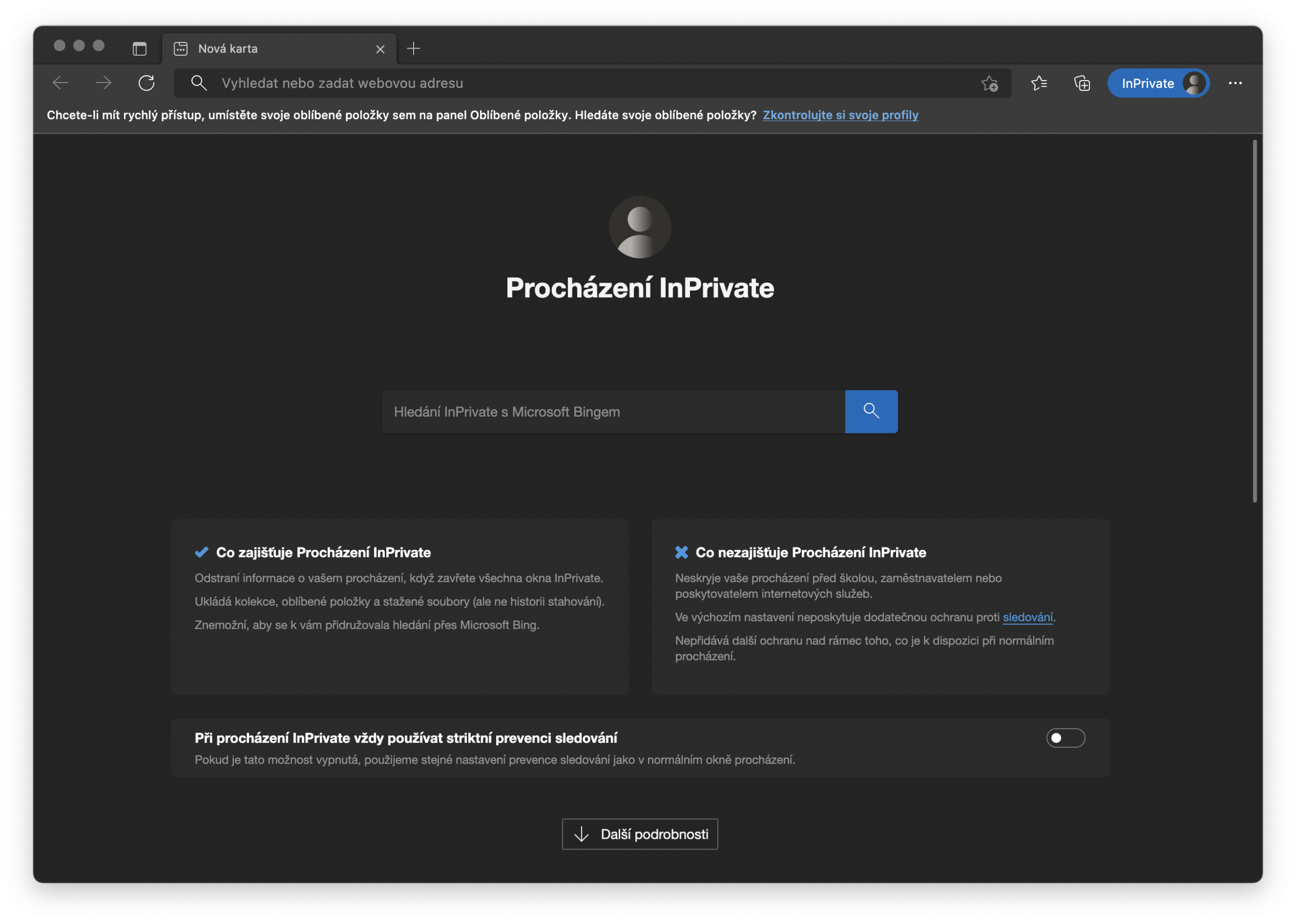 • Odstraní historii procházení. Při procházení webu ukládá webový prohlížeč historii všech webů, které jste navštívili, abyste k těmto informacím mohli později přistupovat nebo abyste mohli automaticky doplňovat adresy, když je zadáte do adresního řádku. Při soukromém prohlížení se historie prohlížení automaticky odstraní, když zavřete všechny karty a okna prohlížeče. Ostatní lidé s přístupem ke stejnému počítači nebo zařízení se tak nemohou dozvědět, které weby jste navštívili, pouhým pohledem do vašeho prohlížeče.