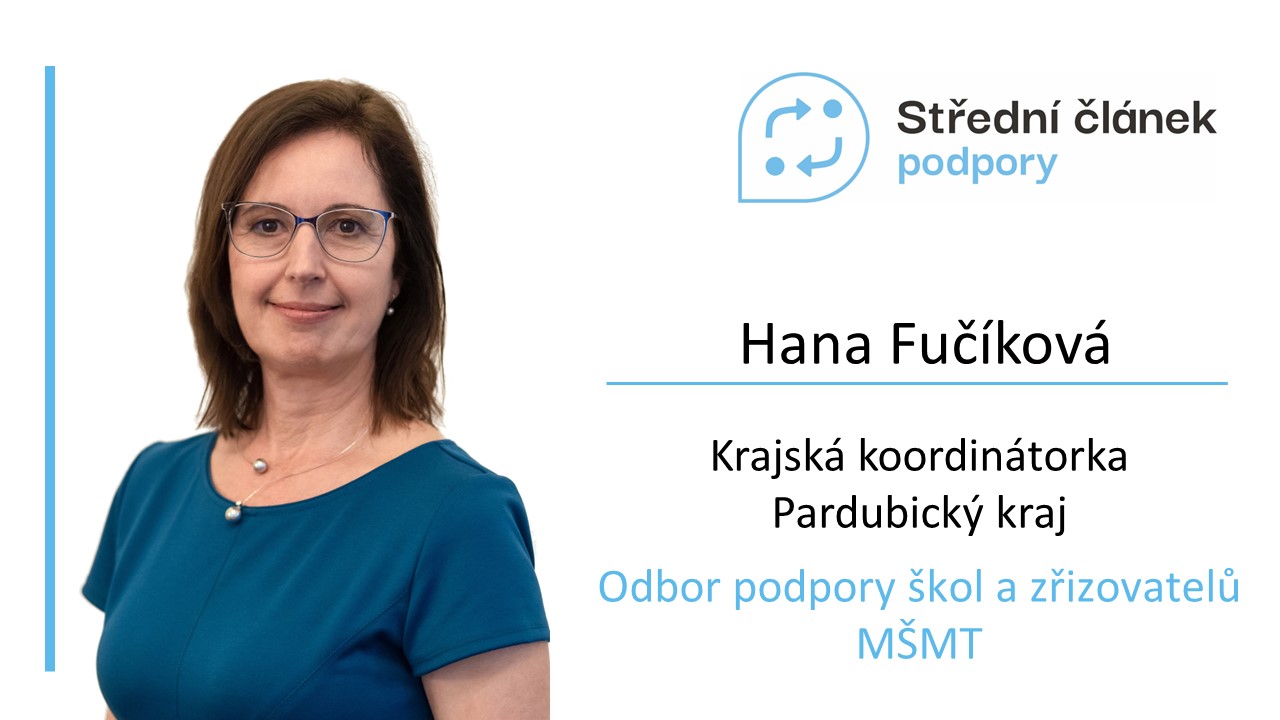 Hana Fučíková začala pracovat ve Středním článku podpory před dvěma roky jako koordinátorka v pilotním okrese Svitavy. Během této doby si vyzkoušela, jak střední článek působí na menším území, aby se nyní pustila do podpory škol a jejich zřizovatelů v celém Pardubickém kraji. Ředitelé z pilotního regionu ji tedy už znají. Vědí, že je umí podpořit kdykoli a v jakékoli oblasti. Dokáže poradit díky svým dlouholetým zkušenostem, znalostem i emotivnímu přístupu.