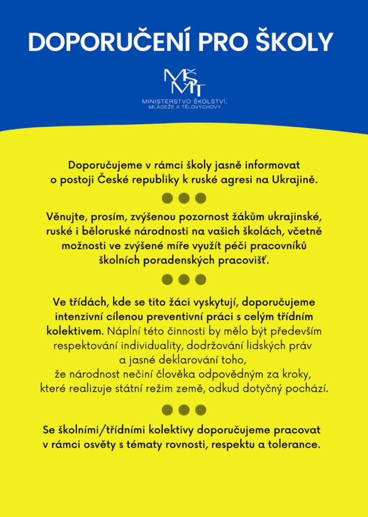 Ve školách se aktuálně vyskytuje více přímé agresivity, negativního postoje a urážek směrem k žákům a studentům ruské, ukrajinské či běloruské národnosti. Může se ale objevit i více symbolické agresivity a fantazie o pomstě, ať už v chování a v projevu mluveném nebo písemném (u menších dětí jsou to kresby, hry).