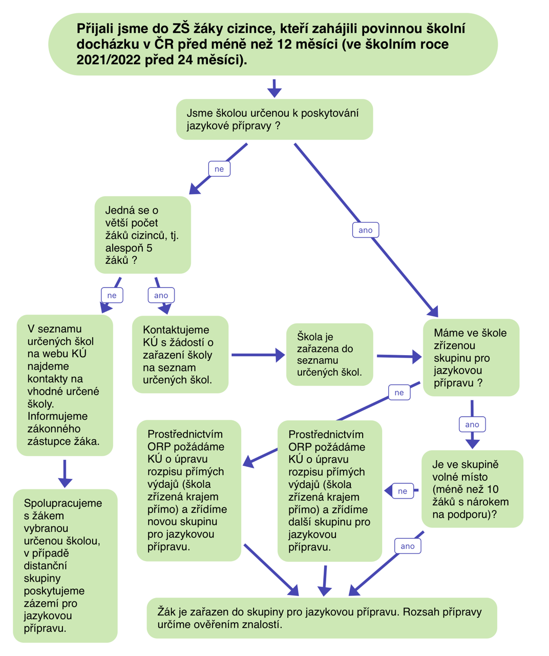 Za ideální řešení pokládáme vznik co nejvíce prezenčních skupin přímo v kmenových školách, které přijaly větší počty cizinců. Lze předpokládat, že k významnému nárůstu počtu skupin pro jazykovou přípravu dojde od září 2022. Škola musí mít pro organizaci skupiny pro jazykovou přípravu personální a prostorové předpoklady. Pokud je nemůže naplnit, bude zákonným zástupcům žáků-cizinců nabídnuta jazyková příprava v jiné určené škole (prezenčně nebo distančně).
