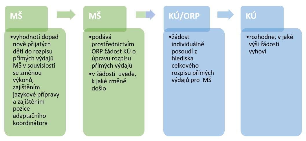 Pokud mateřská škola v souvislosti s přijetím většího počtu dětí potřebuje řešit úpravu rozpisu přímých výdajů, podává žádost příslušnému krajskému úřadu. Mateřská škola zřízená obcí nebo dobrovolným svazkem obcí podává žádost prostřednictvím místně příslušné ORP. Zpravidla se jedná o vznik nové třídy, ale může se jednat také o zabezpečení jazykové přípravy dětí nebo o případné zohlednění výše prostředků na ostatní neinvestiční výdaje (ONIV). V žádosti škola uvede zejména,