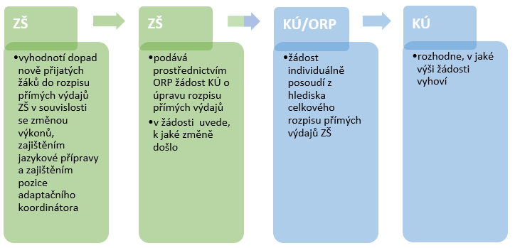 Pokud základní škola v souvislosti s přijetím většího počtu žáků potřebuje řešit úpravu rozpisu přímých výdajů, podává žádost příslušnému krajskému úřadu. Základní škola zřízená obcí nebo dobrovolným svazkem obcí podává žádost prostřednictvím místně příslušné ORP, základní škola zřízená krajem podává žádost přímo krajskému úřadu. Zpravidla se jedná o vznik nové třídy, ale může se jednat také o změnu pásma PHmax, zabezpečení jazykové přípravy žáků či o případné zohlednění výše prostředků na ostatní neinvestiční výdaje (ONIV).