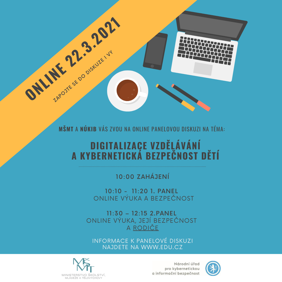 Dne 22. března 2021 proběhne online panelová diskuze s názvem „Digitalizace vzdělávání a kybernetická bezpečnost dětí“, kterou pořádá Ministerstvo školství, mládeže a tělovýchovy ve spolupráci s Národním úřadem pro kybernetickou a informační bezpečnost. Obě instituce tak chtějí podpořit řešení aktuálních problémů, které vyvstávají především v souvislosti s distanční online výukou.