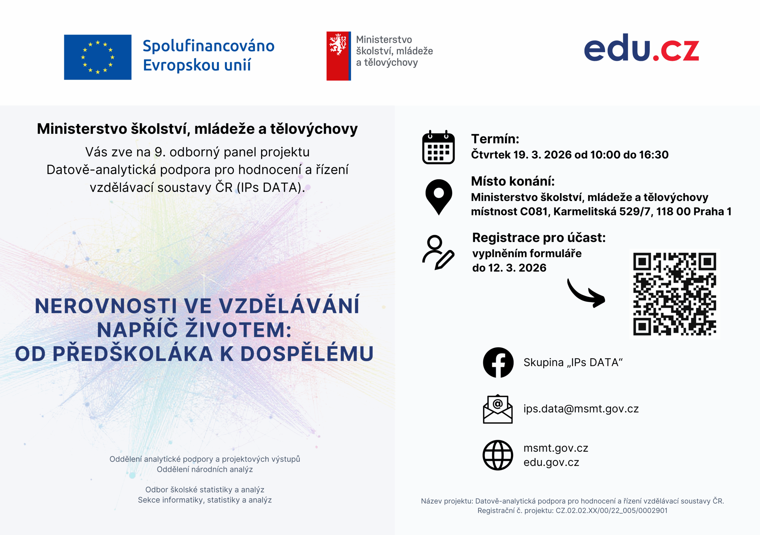 Zveme Vás na 9. odborný panel projektu IPs DATA na téma „Nerovnosti ve vzdělávání napříč životem: od předškoláka k dospělému“. Akce se uskuteční 19. 3. 2026 od 10:00 do 16:30 hybridní formou: současně v prostorách MŠMT a online přes MS Teams.