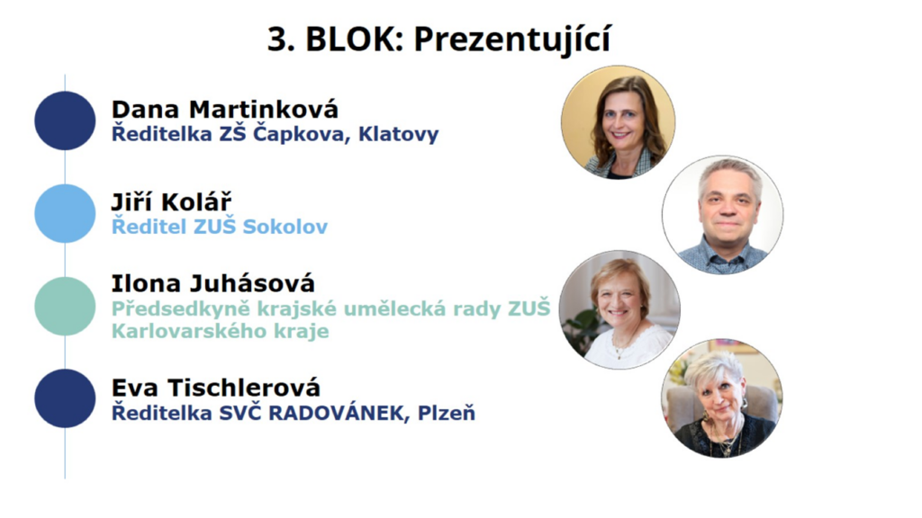 Jiří Kolář ze ZUŠ Sokolov a Ilona Juhásová z Krajské umělecké rady ZUŠ Karlovarského kraje se ve své prezentaci věnovali podpoře nadání v základních uměleckých školách. Zdůraznili zejména význam soutěží pro žáky, ale také roli a pomoc zřizovatele v podpoře jejich realizace. Jako konkrétní příklady podpory ze strany Karlovarského kraje můžeme jmenovat oceňování úspěšných žáků a pedagogů ZUŠ, ale také financování festivalů a soutěží. Příkladem dobré praxe je pak sdílení a výměna zkušeností učitelů s prací s nadanými žáky formou společných koncertů a festivalů ZUŠ.