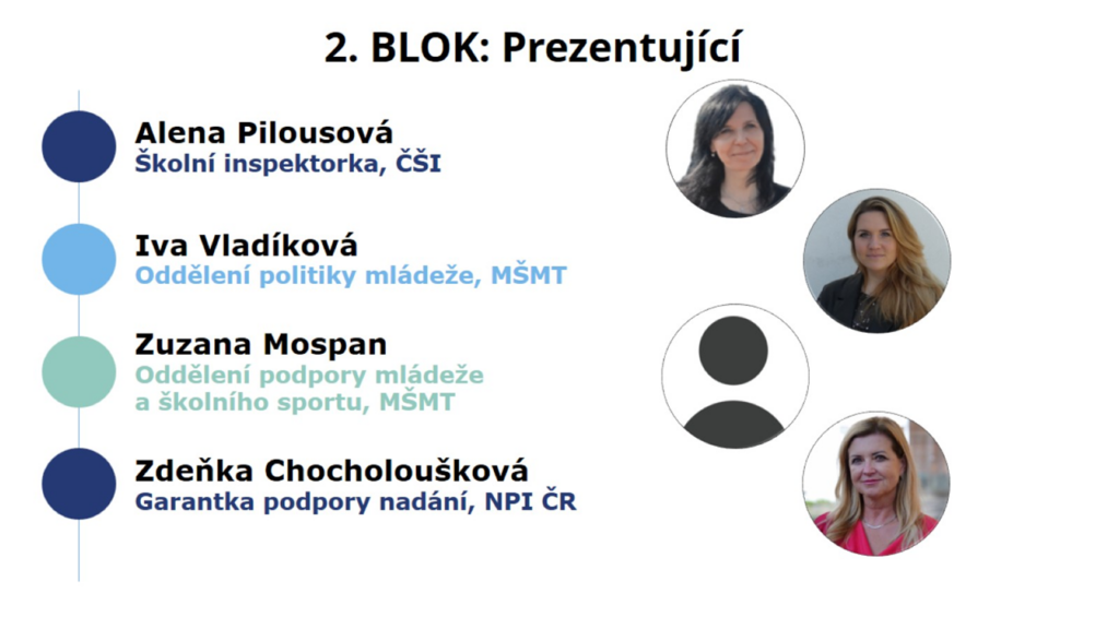 Další prezentující byla Zuzana Mospan z oddělení podpory mládeže a školního sportu MŠMT, která představila dotační výzvy na podporu nadaných a mimořádně nadaných dětí a žáků: