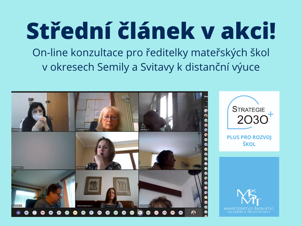 Je to zcela nová situace pro děti, rodiče a mateřské školy. Abychom „mateřinkách“ pomohli, podpořili je a zároveň od nich získali zpětnou vazbu, uspořádal tým středního článku podpory 3. března 2021 on-line konzultaci pro ředitelky pilotních okresů – Semily a Svitavy. Není nad to, když můžete vše společně probrat, doptat se a podělit se o zkušenosti s kolegyněmi a kolegy. O akci byl zájem, debaty se účastnilo téměř 50 ředitelek. Konzultovalo se o 106. Dotazy se týkaly zejména způsobu zadávání aktivit předškolákům, jak komunikovat s rodiči, co zapisovat do třídních knih, jak by měl probíhat výdej obědů a další.
